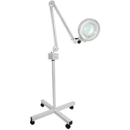 Product Features: 5X Magnification (16 Diopter) 5" Clear and illuminating magnifying lens with protective cover The lens head can rotate left and right with 360 degrees and flip up and down 180 degrees Soft cool bulb for natural color and shadow-free magnification Power on and off switch Easy movement with 4 swivel casters in the base Conveniently adjustable height and arm for magnification in any position Hydraulic look, no visible springs Full English manual Some assembly required Lens Diameter: 5" Base dimension: 24" x 24" Metal pipe height: 23 1/2" Upper arm length: 24 1/4" Forearm length: 21" Voltage: 100-120V Frequency: 60Hz Soft bulb: 22W Read more customer reviews ...